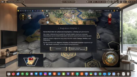 - Oyun dosyalarında değişiklik yapmaz: Civilization 7 Türkçe yama oyunun orijinal dil dosyası üzerinde değişiklik yapmaz. Bu sayede İngilizce oynamak isterseniz ayarlardan kolayca oyunu orijinal diline çevirebilirsiniz. Bazı yama dosyaları oyunun İngilizce dil dosyasını Türkçe diline çevirdiğinden, söz konusu yamadaki bu farkı da bilmek iyi olacaktır.