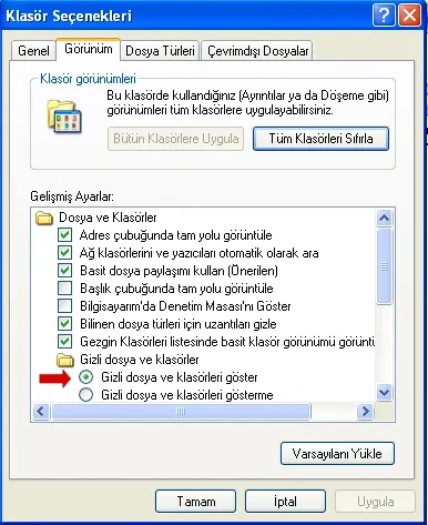 - İlk olarak bilgisayarınızda "denetim masası"na giderek,"klasör seçenekleri"ni seçin. Karşınıza gelen ekranda "Görünüm" menüsünü tıklayın ve "Gizli dosya ve klasörleri göster" deyin.
